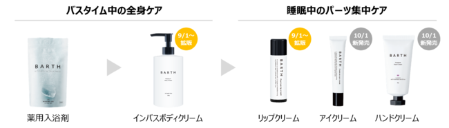 BARTHは、「薬用BARTH中性重炭酸入浴剤」をはじめとする、ナイトタイムを充実させるプロダクトを展開しています。2021年12月の「BARTHプレミアムボディクリーム at bath time」「BARTHプレミアムリップクリーム」の発売に伴い、“バスタイムからスリープタイムまで”のトータルケアがより豊かなものへとランクアップ。更に、2022年10月発売のナイトケアアイテム2種「BARTHプレミアムハンドクリーム」「BARTHプレミアムアイクリーム」を追加することで“睡眠中の美容ケア”のバリエーションを増やし、ワンランク上のナイトルーティンを叶えるラインナップとなりました。