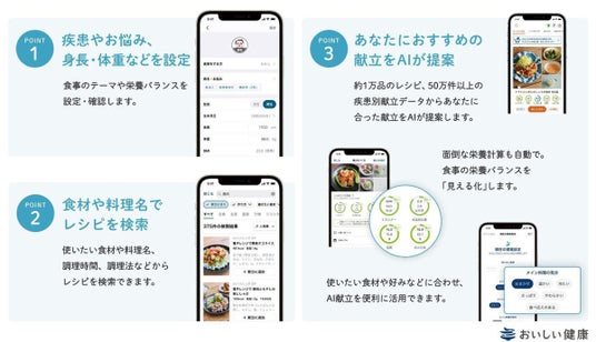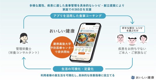 株式会社おいしい健康(代表取締役CEO:野尻哲也)はこのたび、パーソナライズ献立提案・栄養管理アプリ『おいしい健康』を活用した食事コーチング事業を開始しましたことをお知らせいたします。また、本事業のローンチカスタマーとして、学校法人慶應義塾の運営する「慶應義塾大学病院予防医療メンバーシップ」において、2024年1月より本サービスを提供いたします。アプリを活用した食事コーチングの概要パーソナライズ献立提案・栄養管理アプリ『おいしい健康』では、健康的な食生活の維持、ダイエットや妊娠中の食事管理、生活習慣病など様々な病気における食事療法の支援ツールとして多数の方にご利用頂いております。