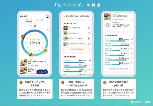 アプリの利用データに基づき、日常生活のモニタリングとアドバイスが可能です。慶應義塾大学予防医療センターへの導入について慶應義塾大学予防医療センターは、東京都港区に竣工した麻布台ヒルズへの移転(2023年11月6日)を機に、「慶應義塾大学病院予防医療メンバーシップ」を新たに開設しました。予防医療メンバーシップでは「一人ひとりの人生と共に歩む医療を」というコンセプトのもと、受診者の希望に合わせて検査メニューをオーダーできる「パーソナライズド・ドック」を提供するほか、人生をより良く生きるために、健康的な生活をサポートするウェルネスケアプログラムを提供することで総合的な健康支援サービスの実現を目指しております。当社のおいしい健康アプリを活用した食事コーチングは、慶應義塾大学予防医療センターの理念に適合するものと評価いただき、このたび、予防医療メンバーシップ会員向けへの導入が決定いたしました。「体力をつけたい」「若々しくいたい」といった会員お一人おひとりのご要望とライフスタイルに合わせ、おいしい健康アプリと管理栄養士が食事や栄養面での個別サポートを行います。今後の展開についておいしい健康アプリを活用した食事コーチング事業は今後、医療機関や健保組合、スポーツチームなどの連携先を拡大すると同時に、より高度なサービス実現に向けたシステム開発、データ解析、臨床研究、人材育成を実施してまいります。おいしい健康アプリと専門家人材によるハイブリッドな栄養管理を通じて、食を通じた病気予防や自己実現をサポートしてまいります。株式会社おいしい健康の概要株式会社おいしい健康は、AI やビッグデータ、最新の栄養科学によって「食事で病気の無い世をつくりだす」データニュートリション・カンパニーです。 AI による献立・栄養管理支援アプリ『おいしい健康』と、時間栄養学に基づく食事タイミング支援アプリ『食べリズム』の提供を主として、食のパーソナライズとバリアフリーを実現。 医療機関や薬局、製薬会社と連携した患者支援、食品企業の健康領域事業を立ち上げ・支援するDXヘルスケアマーケティング事業など、人々の健康に資する多様な事業を通じて、世界80億人が「いつまでもおいしく、食べられる」社会の実現を目指します。社名:株式会社おいしい健康