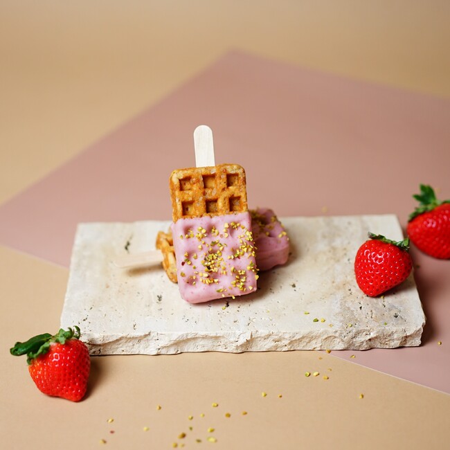 大粒ザラメが入った京ワッフルの生地に、ストロベリーフレークを練り込みました。