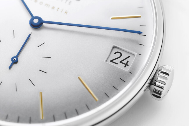 シルバーメッキの文字盤にゴールドのインデックスと青焼きの針がグラスヒュッテの時計作りの伝統にオマージュを捧げながら、ドーム状の文字盤、レンズ状のケース、革新的なムーブメントで、オリオンネオマティックは未来を見ています。