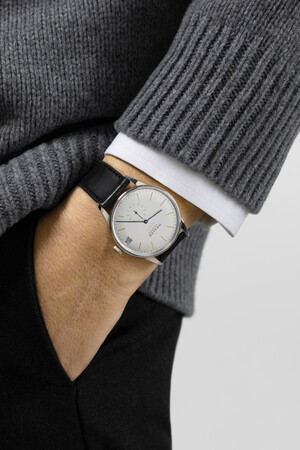 ホワイトシルバーのメッキを施した文字盤に、角張ったゴールドのインデックスと青焼き針が磨き上げられて煌めき、余計なものを排したシンプルなデザインが読み取りやすさを贅沢に実現し、なめらかなレンズのようなフォルムが、エレガントに手首に落ち着きます。