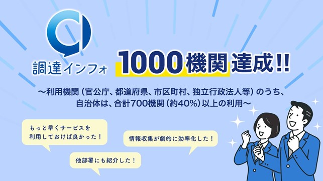 労働力不足問題解決のリーディングカンパニーとして、複数のSaaSを展開する株式会社うるる(東京都中央区 代表取締役社長:星 知也、以下「うるる」)が運営する、官公庁・自治体・独立行政法人向け購買調達サービス 「調達インフォ」は、2022年8月末時点で利用機関数が1,000機関(※1)を突破したことをお知らせいたします。