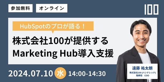 HubSpot Smart CRM(TM)の導入と運用支援サービスを通じてRevOpsソリューションを提供する株式会社100(ハンドレッド、本社:東京都世田谷区、代表取締役:田村 慶)は、2024年7月10日(水)14時から「株式会社100が提供するHubSpot Marketing Hub導入支援」をテーマにオンラインセミナーを開催いたします。