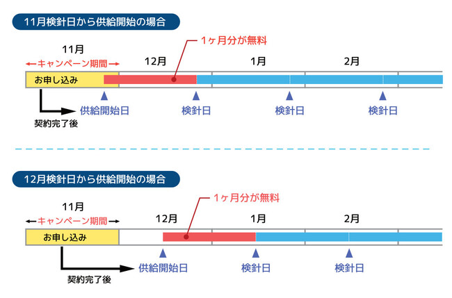 ※引っ越し時にお申し込みされた場合、供給開始日(お客さまにご指定頂いたご使用開始希望日)~次の検針日の期間(無料期間)が1ヵ月間に満たない場合がございます。