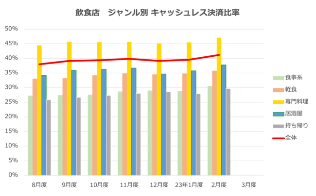 ・飲食店全ジャンルのキャッシュレス決済比率は横ばいが続いていたが、全体のキャッシュレス決済比率が40%を超えるなど、全体的に少しずつキャッシュレス決済比率は伸びている。