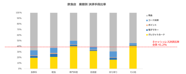 飲食店全ジャンルのキャッシュレス決済比率は41.2%と40%超え。ジャンル別に見ると、引き続き比較的高単価の業態でのキャッシュレス決済比率が高い。
