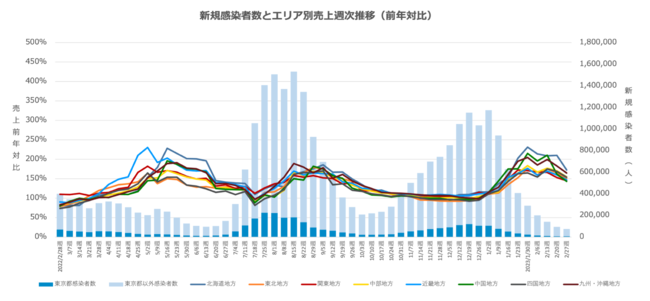 集計内容:飲食店 売上月次推移(前年対比)、新規感染者数とエリア別売上週次推移(前年対比)