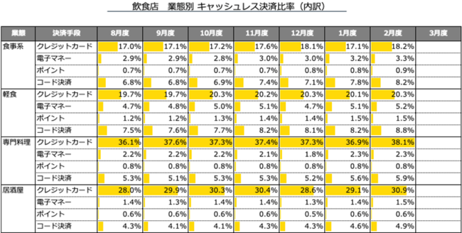 ● 飲食店業態別でキャッシュレス決済比率を1月度→2月度で比較すると、クレジットカード比率はどの業態も伸長が見られる。特に食事系ではクレジットカード比率は前月から+1.1ptと伸びがかなり大きい。
