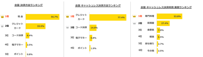 ・全国での決済方法では、現金が最も多く56.7%を占め第1位、クレジットカードが33.5%で第2位。