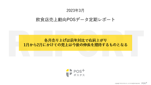 クラウド型モバイルPOSレジの「POS+(ポスタス)」を提供するポスタス株式会社(本社:東京都中央区、代表取締役社長:本田 興一)は、2023年2月度の飲食店売上動向についてPOSデータを基に集計し、結果をとりまとめましたのでお知らせします。