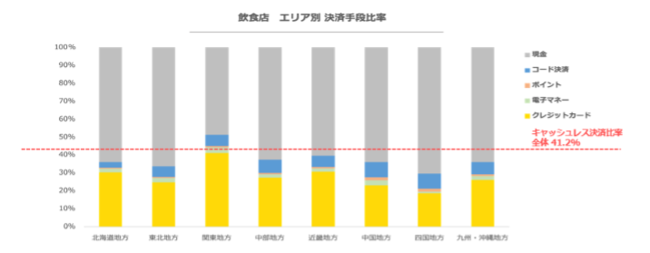 全国のキャッシュレス決済比率は前月39.6%から41.2%に増え、全体でキャッシュレス決済比率が40%突破。キャッシュレス決済比率が49.3%と全国最も高い関東地方は、なかでもクレジットカード決済が先月39.3%より0.3pt増え39.6%。 コード決済は中部地方、中国地方、四国地方では7%を超えている。