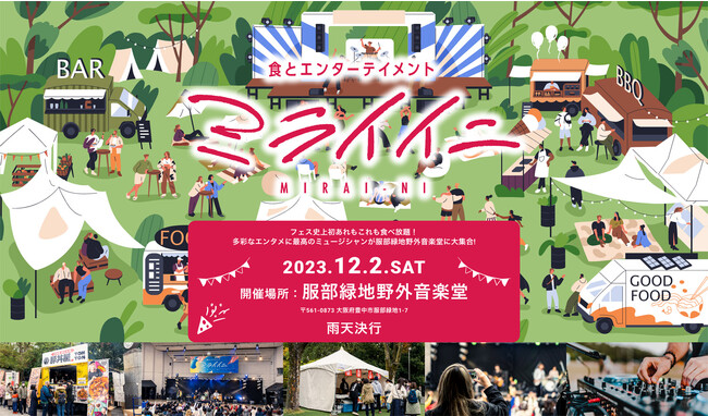 ワンズトライン株式会社(本社:大阪市北区芝田2丁目3番16号、代表取締役:山内仁)は、12月2日(土)大阪・服部緑地野外音楽堂(大阪府豊中市服部緑地1−7)にて“食とエンタメの祭典『ミライイニ』”を開催いたします。