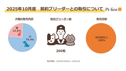 P’s-first直営店では、オークションなどの第三者を経由せず、全国の信頼できる契約ブリーダーからペットを直接取引しています。2025年10月1日から10月31日までにペッツファーストグループが取り扱ったペット、すなわち契約ブリーダーから引き受けたペットの頭数が1,579頭、そのうち犬が76.4%、猫が23.6%です。なお、10月度に引き受けたペットたちは260名の契約ブリーダーと取引いたしました。