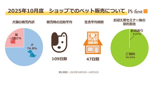 Pʼs-first直営店での10月の販売頭数は1,494頭、内訳は犬が74.8%、猫が25.2%でした。販売時点での日齢平均は生後109日齢、店舗に在舎を始めお客様に迎えられるまでの平均期間47日間でした。