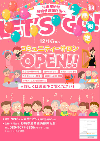 大東市のJR片町線(学研都市線)野崎駅を降りてすぐの場所にある、「野崎まいり」で知られる「野崎参道商店街」では、2023年1月14日(土)までの期間中に、誰でも利用が可能な「コミュニティーサロン」を開設します。