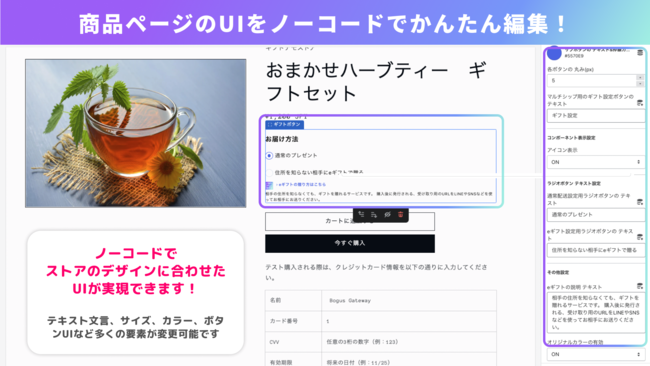 こうしたご要望を受けて、今回「All in gift」では Shopify の Theme app extension 機能を利用し、ノーコードでUIをカスタマイズできる機能を実現しました。
