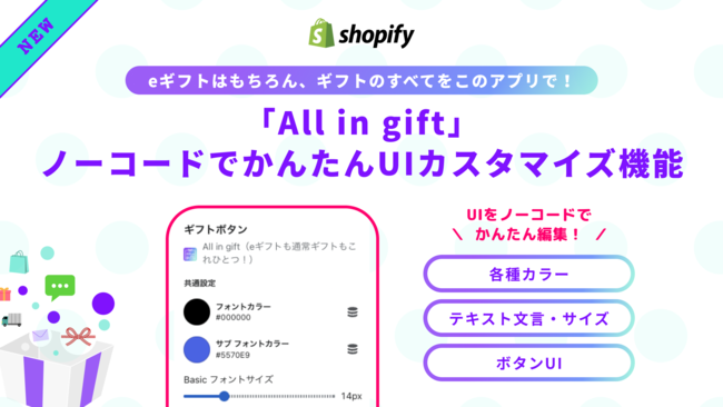 株式会社ハックルベリー(東京都渋谷区、代表取締役社長:安藤 祐輔、以下「ハックルベリー」)が提供する、通常ギフトはもちろん、住所を知らなくても贈れるeギフトにも対応したShopify(ショッピファイ)アプリ「All in gift」は、ノーコードのUIカスタマイズ機能をリリースいたしました。