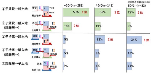 今回の調査で建設前別居の子世帯の住まいが持家か賃貸かと、建設地の所有関係(親土地等・自宅土地・購入地)を組み合わせ二世帯同居移行パタンを分析しました。その結果、30代以下では、子世帯が賃貸で住んでいて、親世帯の土地を活用して二世帯住宅を建設する二世帯同居移行パタンが多い一方で、50代以上では子世帯が既に持家があるのにもかかわらず親世帯の土地に移動するパタンが多いことがわかりました。