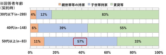 さらに、建設前別居の子世帯の持家・賃貸と建設地の所有の組合せの多いものを年代別に見ると、30代以下では賃貸居住から親の土地で二世帯住宅を建設した方が約6割に対し、50代以上では持家から親の土地で二世帯住宅を建設した方が34%と最も多く、子世帯の持家を建て替えて二世帯住宅を建設した方(11%)の約3倍となりました。子世帯50代以上では、持家を所有していても親の住まいを建て替えて高齢の親と住む選択をする方が30代以下と比較して多いことがわかります。