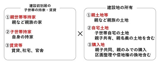 二世帯同居移行パタン:建設前別居の子世帯の持家・賃貸と建設地の所有の組合せ
