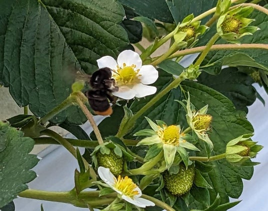 イチゴのビニールハウスでは、働き者のハチさんが一生懸命イチゴの花を受粉しています。ハチさんが働きやすいように、農薬をとことん減らしています。だから、安心・安全のイチゴができています。