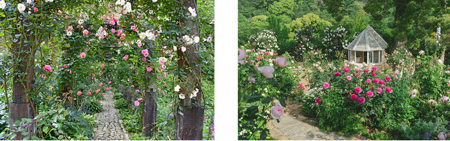 13のテーマガーデンの中には、薔薇をテーマとしたガーデンが9か所あり、ツルバラが木のアーチに沿って植栽された「クライミングローズガーデン(左)」では、ピンクと白色の薔薇がランダムに咲き、薔薇のトンネルを作り出します。英国調のお庭「イングリッシュローズガーデン(右)」は、「パット・オースチン」や「ワイズ・ポーシャ」、「ポートメリオン」など、イングリッシュローズを集めたガーデンです。上品な薔薇の芳香に包まれる散策をお楽しみいただけます。