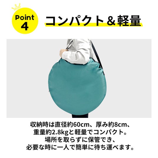 設置・収納は1分程度で簡単に行えます。メッシュ付きの通気口や内側ロック構造など、使用時に嬉しい機能を多数採用し、避難所などのプライバシーの確保が難しい場所でも快適にお使いいただけます!