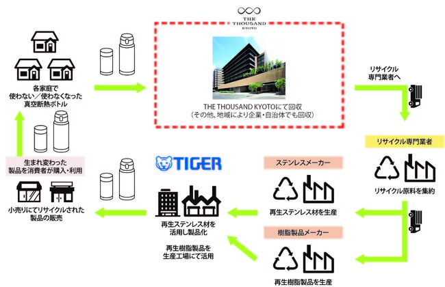 タイガー魔法瓶独自の取り組み「使用済みステンレス製ボトルの回収と再資源化」に、THE THOUSAND KYOTOが 回収拠点として参画します。この取り組みにおいて、京都市内に回収拠点ができるのは当ホテルが初めてです。また、国内の宿泊施設としても初参画となります。