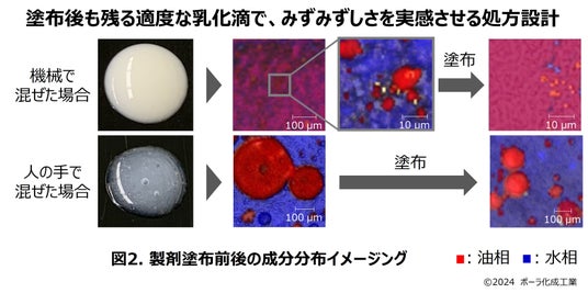 さらに、塗布後も乳化滴や水相を残すことができたことで、機械で乳化した場合と異なり、みずみずしく伸び広がる感触を実現することができました(補足資料2)。