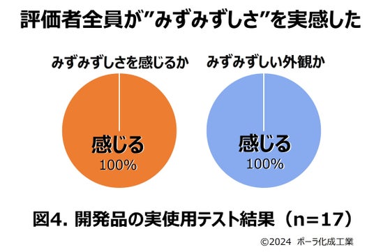 20~50代の専門評価者17名が、2日間にわたって開発品を使って評価した結果を以下に示します。広い範囲に心地よく塗れる感触を目指し、「みずみずしさ」を指標に評価しました。その結果、全ての評価者が感触にみずみずしさを感じると回答。また外観についても同様でした(図4)。これは、「用時調製」式という乳化方法を用いることで、塗布後の適切な油滴の状態を維持でき、優れた実感や透明感のある外観につながったためだと考えています。