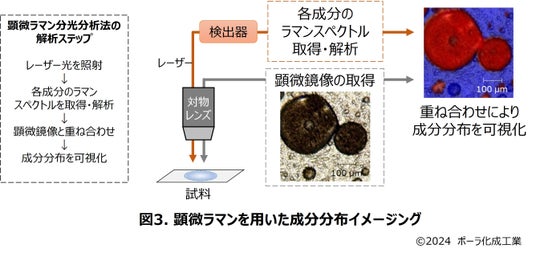 顕微ラマン分光分析法を用いることで、化粧品中の乳化滴の状態を可視化し、処方設計の最適化を行いました。この技術は、ラマン分光装置と光学顕微鏡を組み合わせた装置を用いて、化粧品に特殊なレーザーを当て、分子構造の違いから各成分の居場所を特定しながら、光学顕微鏡で取得した顕微鏡像と重ね合わせることで、化粧品中の成分分布や状態を非破壊かつ迅速に可視化できる技術です(図3)。本研究では、サンプリング法や測定条件を検討した結果、開発品の観察に成功しました。