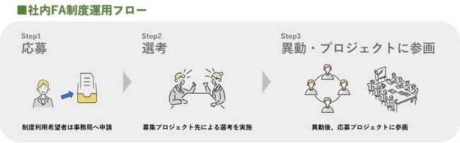 社内FA制度は、全部署を対象に自ら募集プロジェクトへ異動申告ができる制度です。本人からの応募の後、募集プロジェクト先による選考を実施したうえで、新たなプロジェクト・業務に従事することができるようになります。