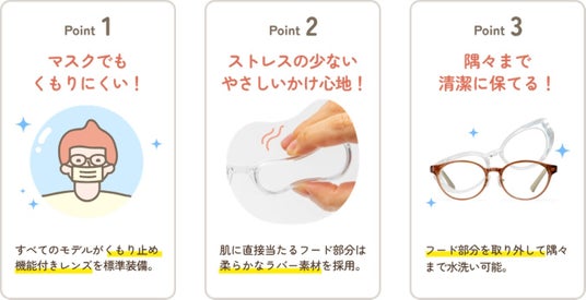眼鏡市場は、花粉・飛沫から目を守るために開発されたメガネ「EYE PROTECTION GLASSES」の新作を、眼鏡市場限定店舗および眼鏡市場オンラインショップにて販売開始しました。防曇機能が付いたレンズ、花粉・飛沫の侵入をブロックするラバーフードを採用し、小さなお子さまから大人の方まで対応できる4サイズで展開します。