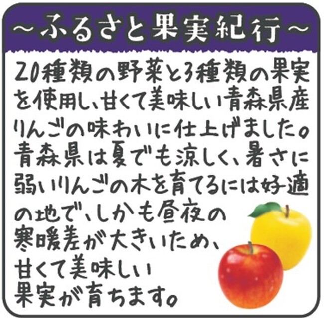 「野菜生活100 青森りんごミックス」は、青森県産りんご(トキ・ふじ)の甘くて美味しい味わいに仕上げた野菜&果実100%ミックスジュースです。「トキ」は青森生まれの品種で、さわやかな甘みが特長。「ふじ」は青森で最も生産されている品種で、甘さと酸味のバランスが抜群です。朝食のおともやリフレッシュしたいときにおすすめです。パッケージの背景には、青森県にある岩木山をりんご畑越しにデザインしています。