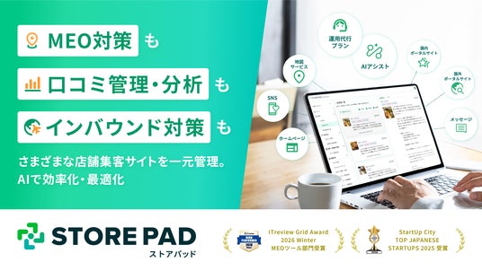 STOREPADは、国内外のさまざまな店舗集客メディアと連携する、店舗情報発信・分析プラットフォームです。地図アプリ・ポータルサイト・インバウンド向けメディア・SNS・HPなど様々な媒体への一括情報発信や口コミ分析で工数削減と集客向上、効果的なMEOを実現。店舗運営を成功に導きます。