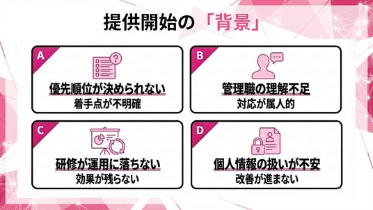 研修・啓発で終わらせず、継続運用に落とし込み、形骸化を防止します。