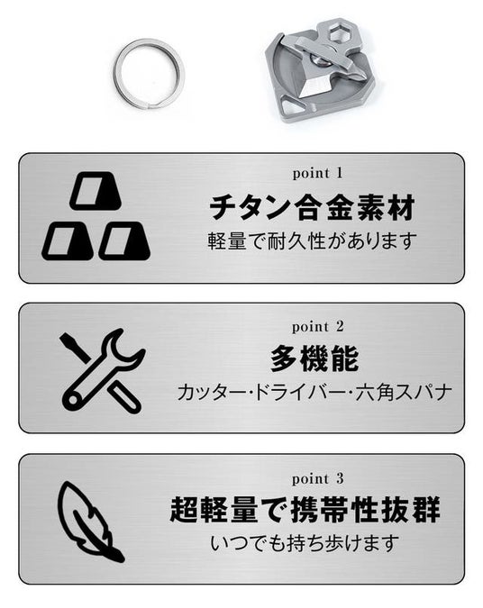 この多機能ツールは、チタン合金を使用しており、軽量でありながら頑丈です。ネジの締め付け、ボルトの固定、ロープのカット、荷物の開封など、様々な用途に対応します。