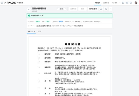 同意文書は電子署名に対応しており、タイムスタンプが付与されます。また契約締結済みのデータは、従業員データベースに自動連携され、一元管理できます。