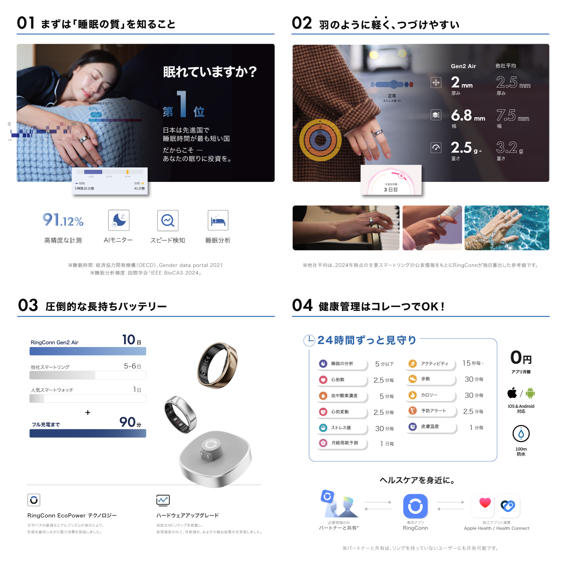 さらに、グローバルで先行展開していた廉価版モデル「RingConn Gen 2 Air」も日本市場で発表。これにより、より幅広い層へのリーチが見込まれています。