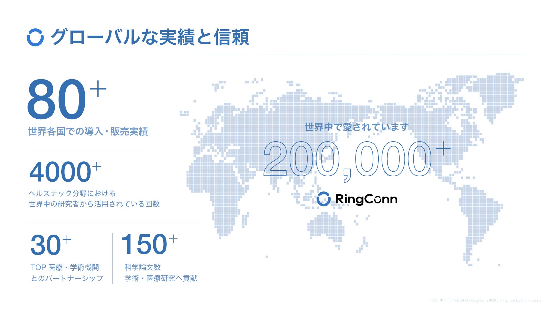 RingConnは、2021年に世界トップクラスの科学者や博士号取得者によって香港で設立されました。『RingConn Gen2(第2世代)』は、2024年夏、米国Kickstarter史上No.1ウェアラブル製品[6.6億円以上/1.8万人以上]の支援を達成し、グローバルでの信頼を急速に獲得しました。そして、2025年2月18日「RingConn Gen2(第2世代)」がMakuakeにて日本上陸。スマートリング史上日本初となる初日で1,600万円を達成し、史上最高応援金額の1.42億円/3,678人の支援を達成し、大きな反響を呼んでいます。その後、約半年の間で14万個→25万個に販売数を伸ばし、ウェアラブルデバイス市場において急成長をしています。