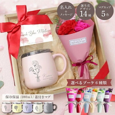 名入れができる真空断熱マグカップと、枯れないソープフラワーのミニブーケをセットにしたギフトボックス商品です。