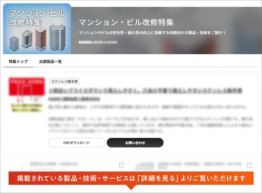 BtoB情報検索サイト「イプロス」「イプロスものづくり」を運営する株式会社イプロス(本社:東京都港区)は、「イプロスものづくり」にて、2025年11月10日(月)から「マンション・ビル改修特集」を開始。さまざまな製品・サービスをまとめて紹介しています。