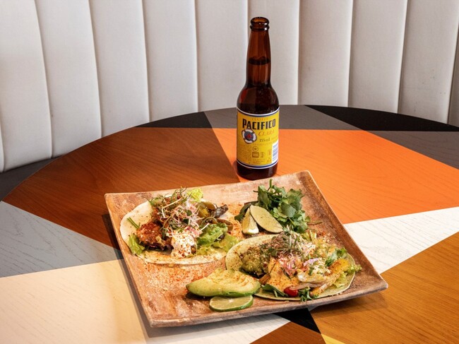 女性に人気のヘルシーなタコス2種(チキン・ベジタブル)を、ここでしか出会えないメキシコのパシフィコビールと一緒にご提供します。