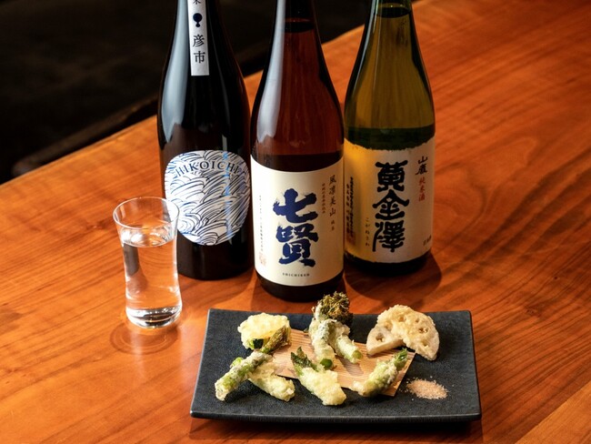 タラの芽など旬の野菜を使ってサクッと揚げた天ぷらの盛り合わせと選べるドリンク1杯のセット。日本酒は天ぷらに合う3種をご用意しております。