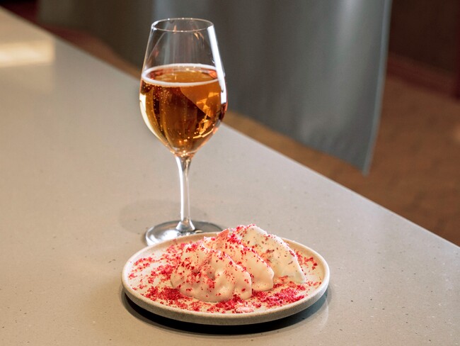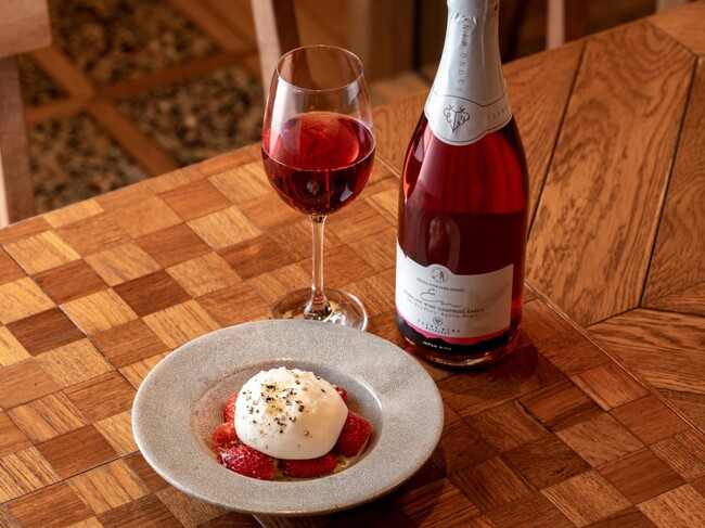 旬のイチゴの甘酸っぱさとブラータチーズの濃厚さが相性抜群の一皿。甘い香りとフレッシュな味わいの宮崎都農のキャンブルスコ ロゼスパークリングとの華やかなセット。
