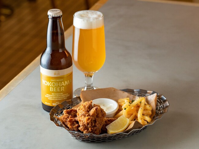 いせはら地ミルクを使った特製フライドチキンとポテトフライ。セットの横浜ビールヴァイツェンはドライ酵母由来のバナナやヴァニラを感じるフルーティーな香り。