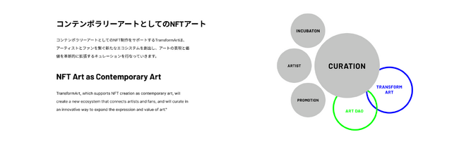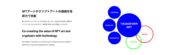 現在、NFTアートやクリプトアートとコンテンポラリーアートが融合し、新たな経済圏やDAO、そしてアートシーンが形成されつつあります。この中で、多彩なエンジニアやデザイナーが在籍するゆめみを背景としたTransformArtは「ART×TECH」を駆使することで、この融合を促進する存在として誕生しました。NFTに取り組むアーティストがコンテンポラリーアートの世界で活躍する機会を共創していくと共に、NFTアートが実際の芸術作品と同等に評価されることを目指しています。次世代のアーティストと共に価値変換(トランスフォーム)を進めるためのノウハウや技術を惜しみなく提供するとともに、社会に新たな価値を創造するための実験を積極的に進めてまいります。