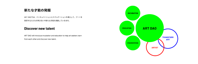 ART DAOでは、インキュベーションとエデュケーションを導入して、アートを探求する人たちの学び合いや新たな才能を発掘していきます。同時に、批評性のある場として、アーティストのみならずアートコレクターやエンジニアなどが集い、独自のエコシステムを構築していきます。さらに、美大芸大生をメインターゲットに、アワード開催などを通じて次世代NFTアーティストの発掘や育成も行っていきます。ゆめみのマーケティングチームが作品の販売方法やマーケティング手法を提供しながら活動をサポートします。