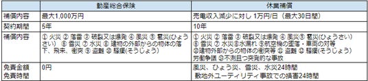 ・災害や盗難などに備えて、太陽光発電設備に動産総合保険の必要性は高まっております。そこで、本サービスには、下記条件の動産総合保険、休業補償が自動付帯されています。